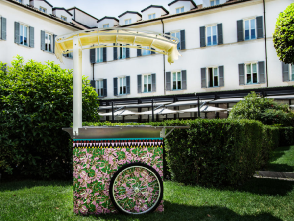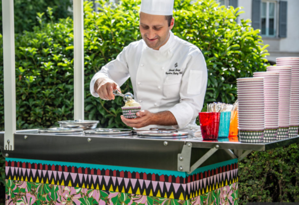 Nel giardino del Four Seasons Hotel Milano arriva il nuovo gelato artigianale, servito nello speciale carrello e nelle esclusive coppette disegnate da JJ Martin.