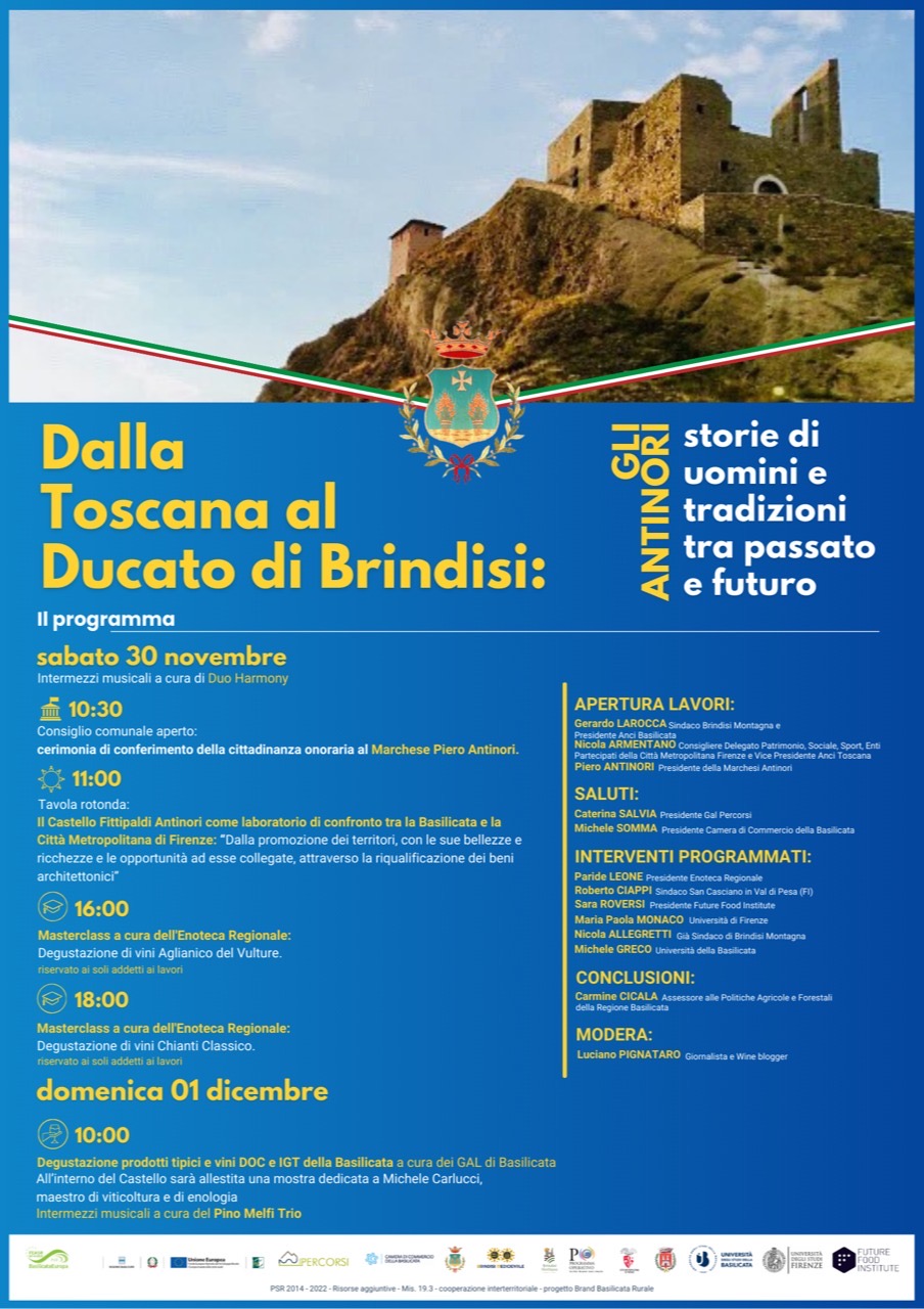 Un evento straordinario che celebra il legame tra storia, tradizione e futuro: sabato 30 novembre e domenica 1 dicembre a Brindisi Montagna (Potenza), presso il Castello Fittipaldi Antinori, si terrà l’evento “Dalla Toscana al Ducato di Brindisi: gli Antinori, storie di uomini e tradizioni tra passato e futuro”, organizzato dal Comune di Brindisi di Montagna con il supporto del GAL Percorsi e della Camera di Commercio della Basilicata, una iniziativa che rappresenta un’importante occasione per mettere in luce le eccellenze enogastronomiche, culturali e architettoniche del territorio e che vedrà il suo momento centrale nel conferimento della cittadinanza onoraria e nella consegna delle Chiavi della Città al Marchese Piero Antinori, figura simbolo dell’eccellenza vitivinicola italiana, “in segno di riconoscenza per il legame indissolubile che unisce la Sua illustre famiglia alla nostra comunità”, cerimonia in programma sabato 30 novembre alle ore 10.30.