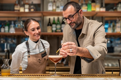 - Drops of Gold – Un’esplorazione tra Sicilia e Valle d’Aosta, con whisky Nikka infuso con olio extravergine d’oliva della Valle del Belice, che conferisce una texture vellutata, e caffè filtrato che ne esalta la struttura. La dolcezza del Ratafià valdostano si bilancia con la freschezza del succo d’ananas, creando un mix armonioso. Tre gocce di olio extravergine vengono adagiate sulla superficie per arricchire il profilo aromatico con un tocco elegante e inaspettato.