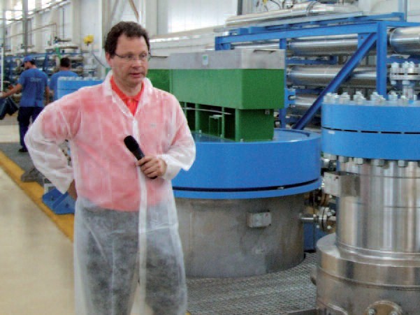 Dopo aver visitato le zone della fabbrica che preparano la granelle di sughero attraverso procedimenti meccanici evidentemente rumorosi, entriamo nel cuore tecnologico, silenzioso e asettico dell’azienda, “dove avviene un processo – ci spiega Dominique Tourneix, direttore generale dell’azienda, e conoscitore profondo dell’applicazione sul sughero avendo partecipato in prima persona all’attività di ricerca – che spoglia il sughero dai problemi che lo