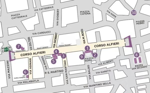 Proseguendo in corso Alfieri si giungerà alla Douja del Monferrato nella cornice del prestigioso Palazzo Alfieri dove sarà possibile degustare gli ottimi vini tutelati dal Consorzio Barbera e Vini del Monferrato.