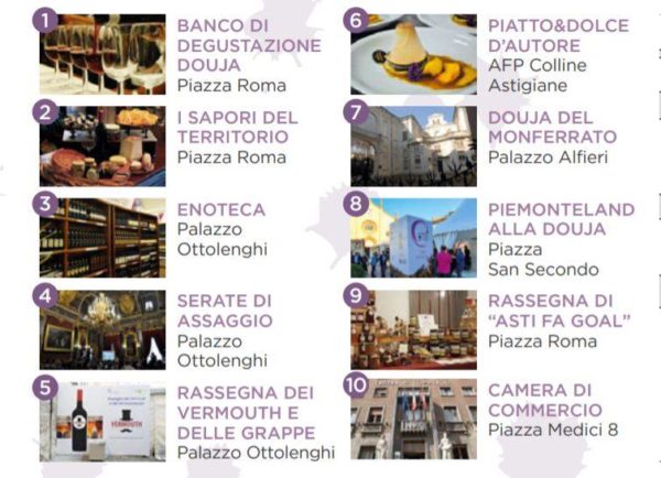 Il Salone si conferma come un evento diffuso che si snoda nel centro storico di Asti, partendo da piazza Roma, dove sono allestiti il banco di degustazione dei vini premiati, il mercatino delle specialità̀ agroalimentari del territorio, passando per Palazzo Ottolenghi che ospita, oltre alla cantina dei vini della Douja, la Rassegna dei vermouth e dei vini aromatizzati, le grappe del premio Alambicco d’Oro e i migliori distillati del Piemonte, per arrivare alla Scuola Alberghiera, dove si possono gustare il piatto e il dolce d’autore accompagnati da Doc e Docg di eccellenza del territorio.