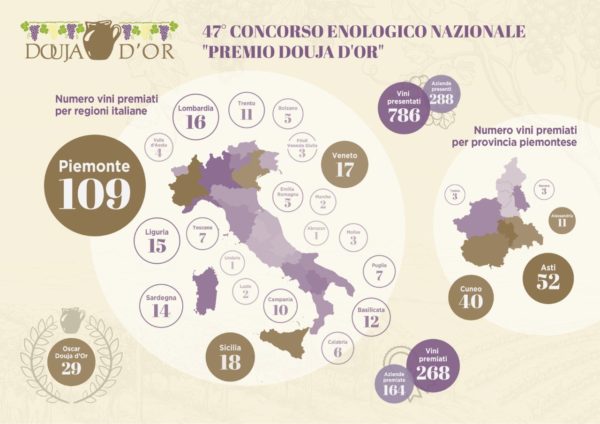 Per questa edizione del Salone della Douja, dal 6 al 15 settembre 2019, il centro storico di Asti si trasformerà come sempre in una coloratissima “città del vino” all’interno della quale verranno presentati, in degustazione e in vendita, tutti i vini Doc, Docg e Igp premiati al 47° Concorso enologico nazionale Premio “Douja d’Or 2019”: 268 le etichette selezionate, rappresentative di 164 aziende di tutta Italia, in cui svetta il Piemonte, premiato con ben 109 vini, seguito a distanza da Sicilia (18) e Veneto (17). Sul podio delle province piemontesi, Asti con 52 etichette premiate, seguita da Cuneo (40) e Alessandria (11). Ventinove i vini che sono riusciti a ottenere il prestigioso Oscar Douja d’Or.