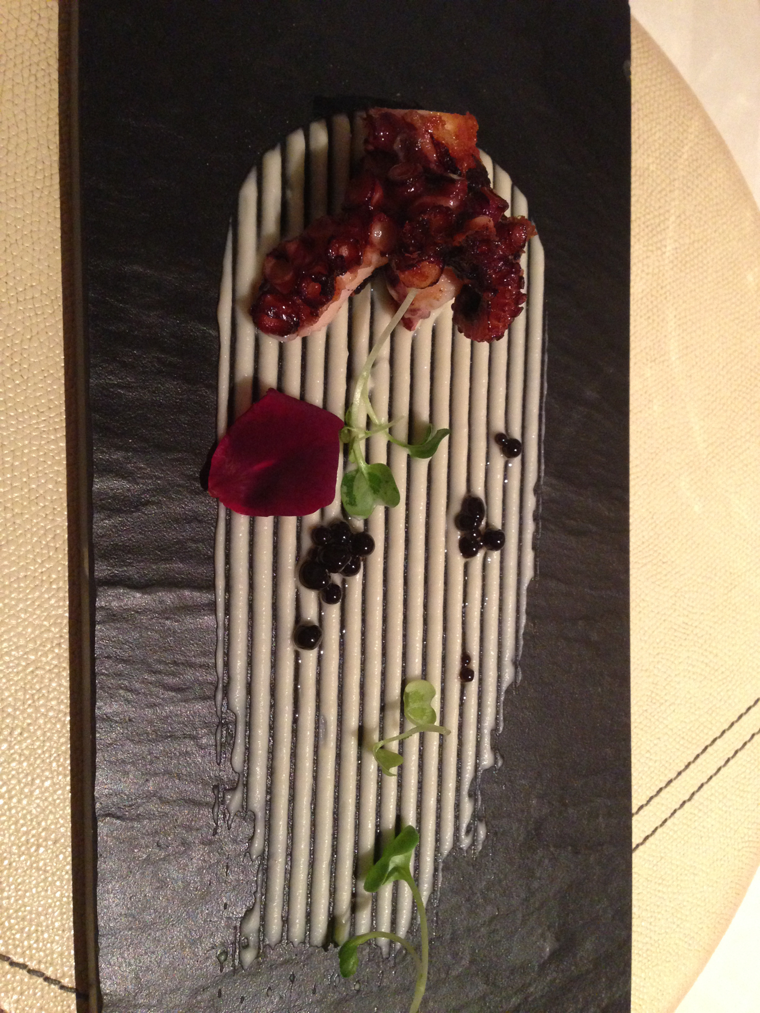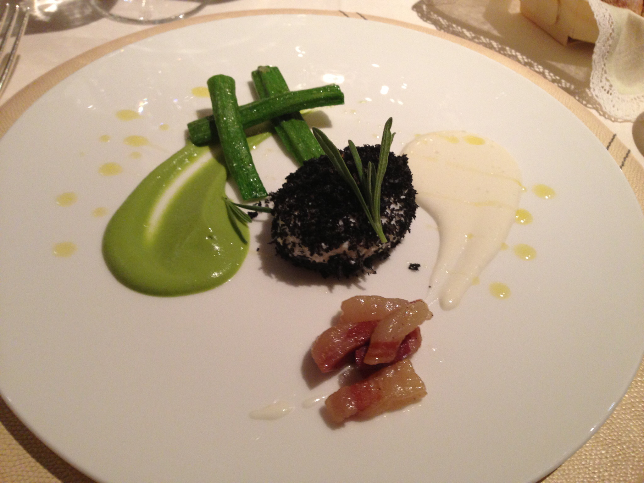 Si parte con calice di champagne in abbinamento ad una corposo benvenuto: polpo e sedano rapa, praline di tonno, uovo avvolto nella cenere e crema di taleggio; coda di rospo farcita con sopressata e fritta.