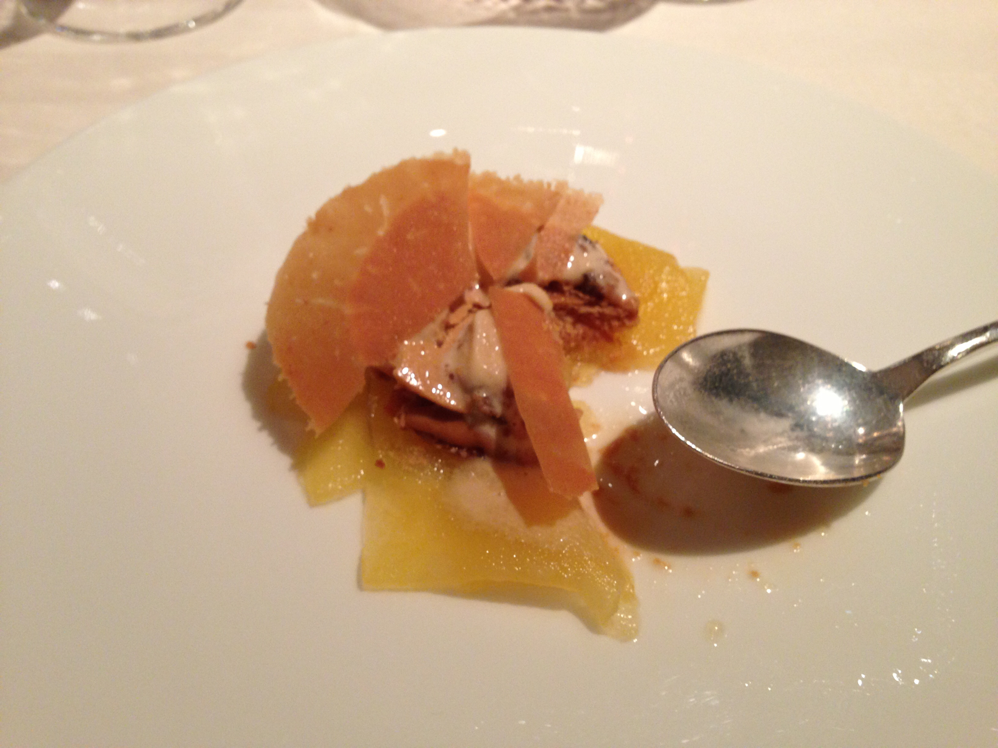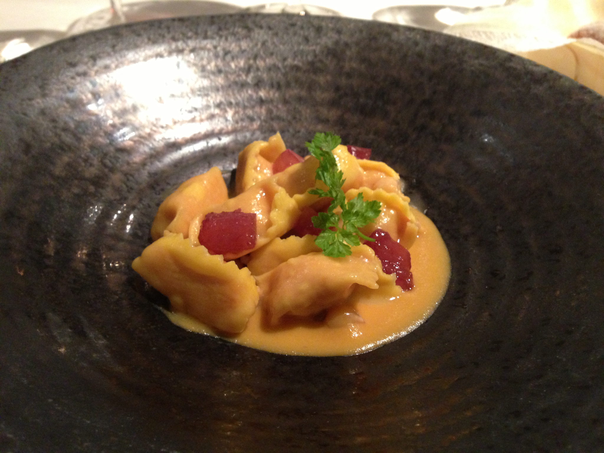 E’ il momento dei primi, ed ecco arrivare degli agnolotti con ripieno di piccione e rapa rossa in crema di parmigiano. La pasta è tirata alla perfezione, il ripieno di piccione e rapa trova il giusto equilibrio in una farcia morbida e delicata. La crema di parmigiano avvolge la pasta perfettamente contribuendo decisamente alla riuscita di questo piatto.