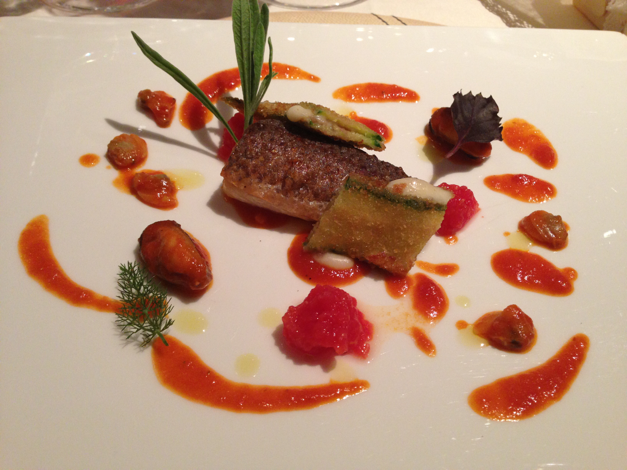Arrivano i secondi e s’inizia con un piccione arrosto con fagioli all’uccelletto, doveroso omaggio alla regione che ospita questo tempio del gusto. A seguire un sorbetto al limone e menta ci prepara il palato alla portata di pesce che sarà un filetto di branzino in salsa piccante.