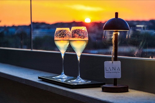 Appena varcata la soglia d’ingresso della terrazza si trova il cuore pulsante di Lana, spazio en plein air (sovrastato da pergotende richiudibili) in cui l’attenzione viene subito catturata dall’imponente bancone lungo sei metri e dalla bottigliera in ferro, custode di una ricercata e ampia scelta di spiriti pregiati. Si parte tutti i giorni (attualmente, nel periodo estivo, domenica esclusa) alle ore 18 con l’Aperitivo, in cui ogni drink esce di default con una selezione di salumi, formaggi e assaggi vari.