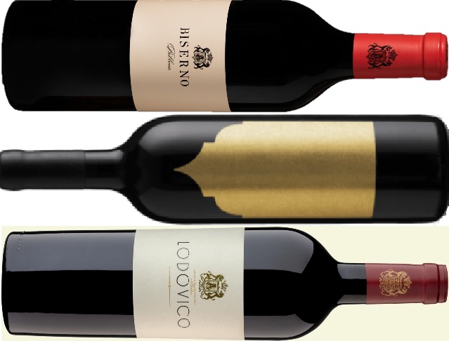 Nella foto di apertura tre etichette italiane che ha recentemente contribuito a realizzare: dall’alto Biserno, Montefalco Sagrantino 50 anni (Arnaldo Caprai) e Lodovico.