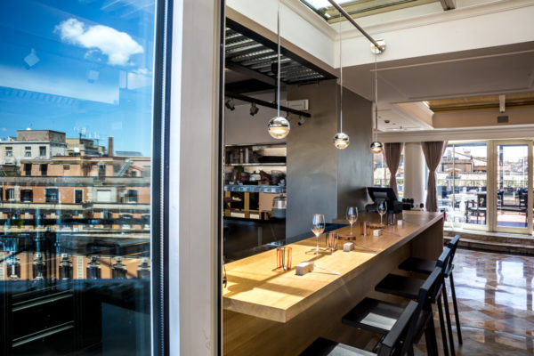 Dicevamo cambiamenti, che hanno coinvolto il ristorante sotto tutti i punti di vista. Certamente il più evidente è quello relativo alla cucina che è letteralmente entrata nella sala. E’ una bellissima cucina a vista, realizzata dalla De Manincor di Bolzano. Da una parte si rivela completamente verso la sala offrendo agli ospiti lo spettacolo del lavoro in cucina. Dall’altro lato invece, grazie alla parete con finestra, guarda il magnifico panorama che offre la Capitale. I cuochi si muovono come su un palcoscenico, senza essere invadenti verso il cliente ma chiaramente percepiti. E’ stato realizzato anche un bancone in legno massiccio, con alti sgabelli, posizionato di fronte la cucina  per offrire agli ospiti la possibilità di seguire live la realizzazione dei loro piatti che verranno serviti direttamente dallo chef.
