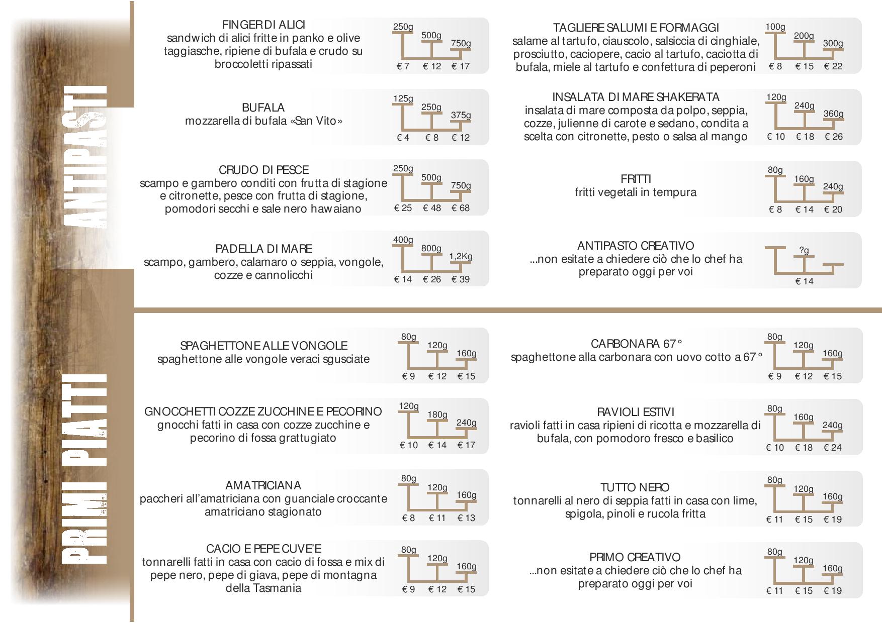 Il menù attinge dalla tradizione gastronomica mediterranea, dunque materia prima di stagione, piatti snelli con pochi ingredienti, e si può scegliere tra primi e secondi a base di carne , pesce o verdure. La formula PESO, udite udite… è valida anche per i dessert!