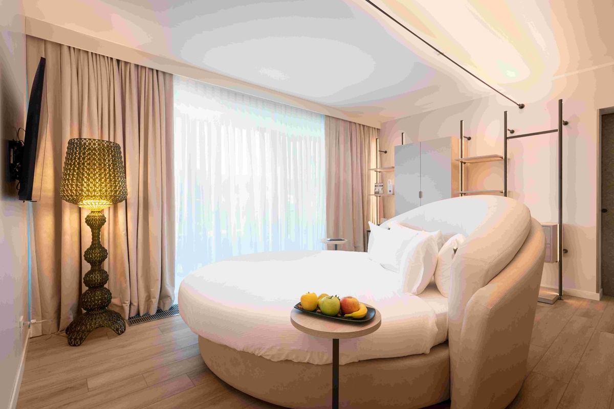 Uno splendido design hotel che ha sviluppato e concretizzato un importante progetto di sostenibilità – testimoniato dalla prestigiosa certificazione ClimaHotel – attraverso un’ampia gamma di scelte consapevoli: dai materiali bio-compatibili utilizzati per la sua costruzione – il legno costituisce al 100% l’ossatura dell’hotel -, fino all’impiego di energie rinnovabili e software gestionali che controllano il risparmio energetico idrico e l’insonorizzazione naturale certificata. Le camere – 125, di cui 18 suite – sfruttano i principi dettati dall’eco climatizzazione per la veicolazione dell’energia naturale senza utilizzo di radiatori e condizionatori. Lo stile è moderno ed essenziale, mentre davvero particolare è l’esperienza offerta dalle due esclusive Prestige Round Suite dal design contemporaneo e dall’atmosfera soffusa che fa ritrovare calma e serenità.