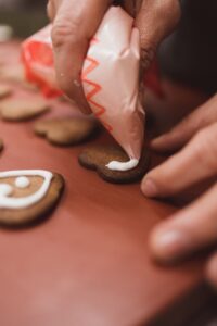 - Versare della glassa colorata dentro un piccolo cono fatto con della carta da forno, tagliarne la punta e decorare i biscotti.