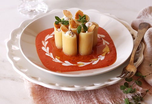 Paccheri farciti con ricotta e gamberi su salsa rosa