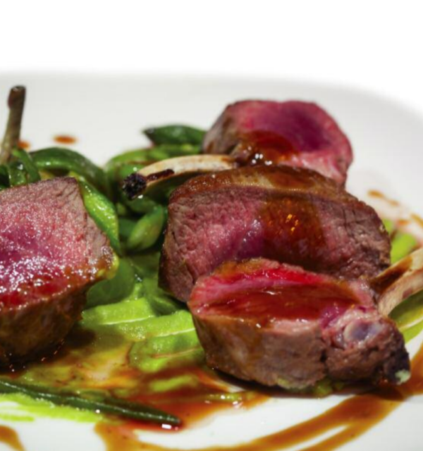 Porzionare la sella di agnello separando i lombi dalle costolette e mettere da parte. Mondare e lavare tutte le verdure quindi sbollentarle separatamente per pochi minuti in acqua bollente, lasciandole croccanti. Condirle con olio extravergine di oliva, sale e pepe e tenerle in caldo. Grigliare leggermente lombi e costolette da ambo i lati giusto il tempo di sigillare i tessuti per trattenerne i succhi. Completare la cottura in forno per otto minuti a 180 °C lasciando il cuore dei lombi rosa. Far sbollentare i piselli. Nel frattempo, preparare un fondo con la cipolla tritata, la pancetta tagliata a listarelle e l’olio extravergine di oliva e far soffriggere leggermente, quindi scolare i piselli e versarli nella padella con il soffritto. Lasciare insaporire a fuoco medio per pochi minuti, togliere dal fuoco, versare tutto nel bicchiere di un mixer a immersione e