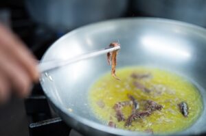 - Far soffriggere i due spicchi d’aglio con l’olio extravergine “penisola Sorrentina” Linea Sabino Basso e le alici in una padella a fuoco lento. Nel frattempo preparare un trito di prezzemolo, noci e peperoncino. E tenerlo da parte.