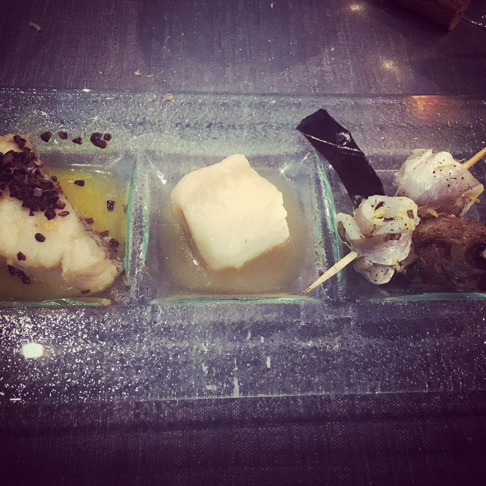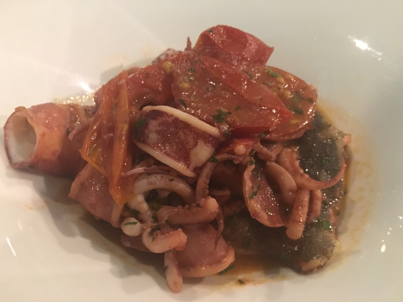 Ci lasciamo guidare dallo chef che ci da il benvenuto con un calamaro ripieno di crema di patate accompagnato da pomodorini. A seguire una variazione di merluzzo che arriva marinato in spiedino, in guazzetto all’aroma di limone e il trancio cotto a bassa temperatura finito con scaglie di cioccolato extra fondente. In questi primi piatti, come pure negli altri a seguire, ciò che emerge con prepotenza è la combo vincente tra l’eccellenza delle materie prime usate e l’utilizzo delle techiche di cottura e preparazione da parte dello chef. Considerazione valida anche per i piatti più “azzardati” come il merluzzo con il cioccolato fondente che invece si è rivelato essere una grande sorpresa.