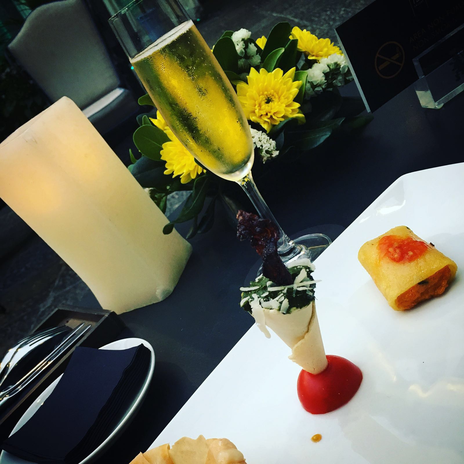 Dicevamo aperitivo ed arrivano un tortino di pasta phyllo con crema di patate e gambero, un cono di biscotto salato farcito con friarelli napoletani e pecorino e un pacchero fritto ripieno di polpa di gambero. La partenza è quella giusta.