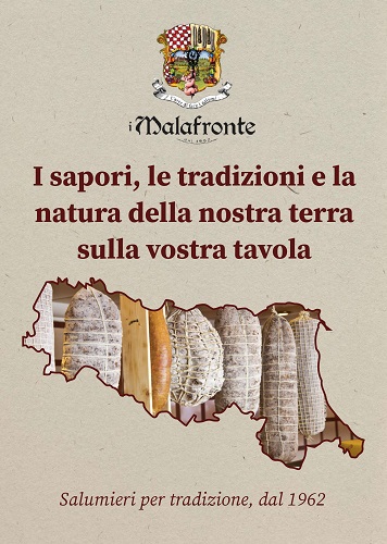 Esperienza e passione per l’arte norcina sono le radici dell’eccellenza dei salumi I Malafronte che si esprime al meglio nella nuova proposta degli Affinati. Per produrli sono utilizzate solo le migliori carni di suini 100% italiani, lavorate con maestria artigianale da norcini che, grazie a mix di spezie e aromi naturali, ne esaltano sapore e profumo. Proprio tramite il delicato processo di affinatura, per cui sono fondamentali grande conoscenza, capacità ed esperienza, i salumi acquisiscono una personalità distintiva. Anche il luogo dell’affinatura è importante perché imprime la propria traccia sul prodotto. Così, il clima di Consandolo, nel ferrarese, dove si trova la norcineria I Malafronte, insieme alla vicinanza del fiume Po, costituiscono le condizioni ideali di umidità, temperatura, ventilazione per la stagionatura di questi salumi.