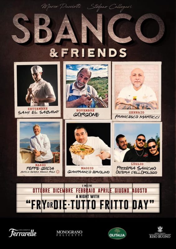 La seconda stagione di Sbanco&Friends sarà scoppiettante grazie all’ alternarsi ogni mese di alcuni amici di Marco e Stefano, provenienti da tutta Italia per eseguire a quattro mani pizze indimenticabili, ma anche fritti nelle giornate del Tutto Fritto Day, dal motto #fryordie: lunghe maratone di supplì, frittate di pasta, polpette e montanare che vi ingrasseranno nei mesi di ottobre, dicembre, febbraio, aprile, giugno ed agosto.