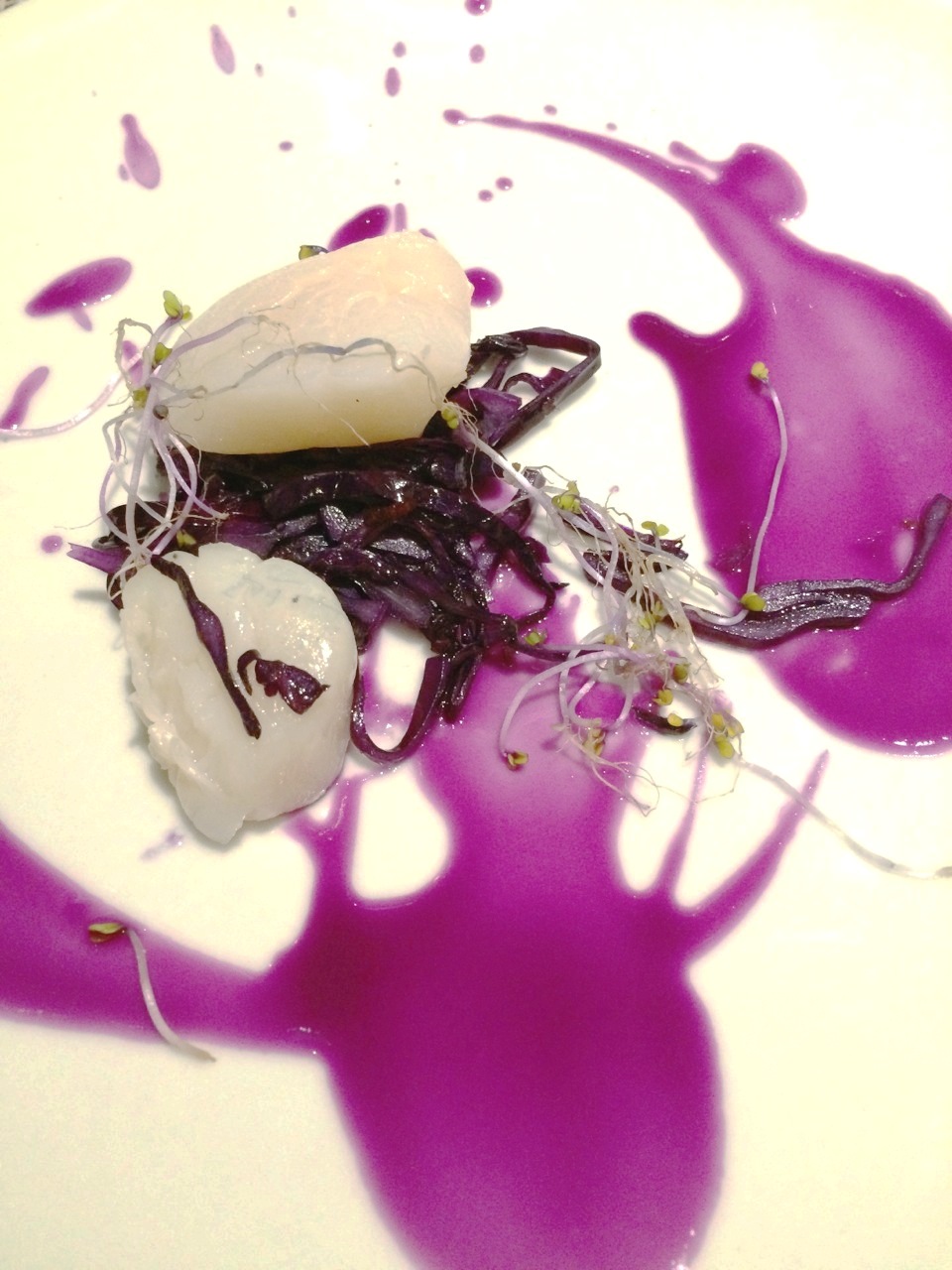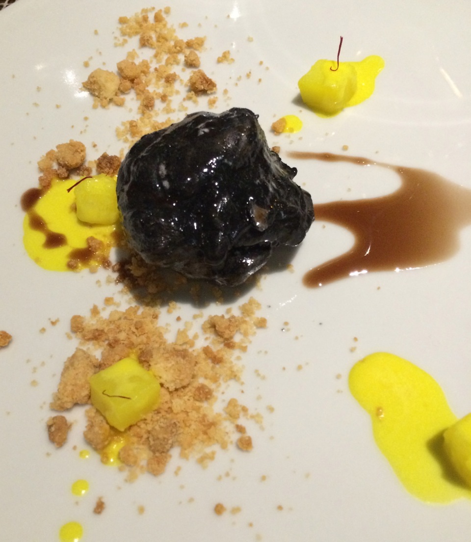 Tornando ad Armonie d’eccellenza la cena è continuata con chitarra alle erbe e lumache di mare, un piatto dal delicato equilibrio tra i sentori salmastri e la delicatezza del cereale alle erbe, abbinato al Trentodoc Riserva Lunelli 2006, sempre Cantine Ferrari, prezioso, strutturato, equilibrato. Quindi coda di rospo all’olio extravergine di olive nere, un olio straordinariamente intenso e scuro, con crumble alle mandorle e patate allo zafferano, una proposta originale dal gusto poliedrico, ampio nei sentori uniti ma ben distinti che non sempre ha trovato continuità nel Perlé Rosé Ferrari 2008, fruttato e tostato con lievi note speziate, e infine per chiudere in fresca ed esotica dolcezza ananas marinato, lime, pepe rosa, mango e cocco…trionfo di raffinata soavità abbinata all’elegante, morbido, dolce, Maximum Demi-sec dai ricordi di vaniglia.
