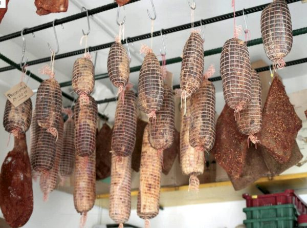 Qui incontriamo Rocco, titolare dell’azienda, che caparbiamente ha combattuto e vinto contro l’ottusità burocratica ed è riuscito a mettere in piedi, creandola dal nulla, una attività imprenditoriale di notevole interesse e ci spiga la filosofia aziendale. L’allevamenti dei maiali di cinta avviene allo stato brado e semibrado in vaste aree recintate ricche di boschi. Gli animali vengono alimentati a ghiande di quercia, sia quelle dolci della quercia che quelle amare del leccio, ma anche di tuberi, radici e materiale organico del tappeto erboso con aggiunta di orzo, fave, mais e soia in un mix che dona alla carne sapore e caratteristiche particolari come i positivi effetti sulla sapidità e sulla succulenza della carne:che risulta più rossa e gustosa delle altre carni suine. Le carni hanno migliori qualità dietetiche per la maggiore concentrazione di acidi grassi insaturi, in particolare della serie Omega 3 e Omega 6 (che, oltre a una diminuzione dei grassi nel sangue, hanno una azione antitrombosi). Inoltre, il suo tessuto adiposo e più ricco di acido oleico (quello che tiene lontano il colesterolo) e di acidi grassi polinsaturi rispetto a quello tradizionale e il suo grasso è meno consistente e più fluido, perciò molto più gradevole al palato e questa fluidità, dovuta ad una maggiore insaturazione, permette nei salumi che si ottengono, una più rapida diffusione.